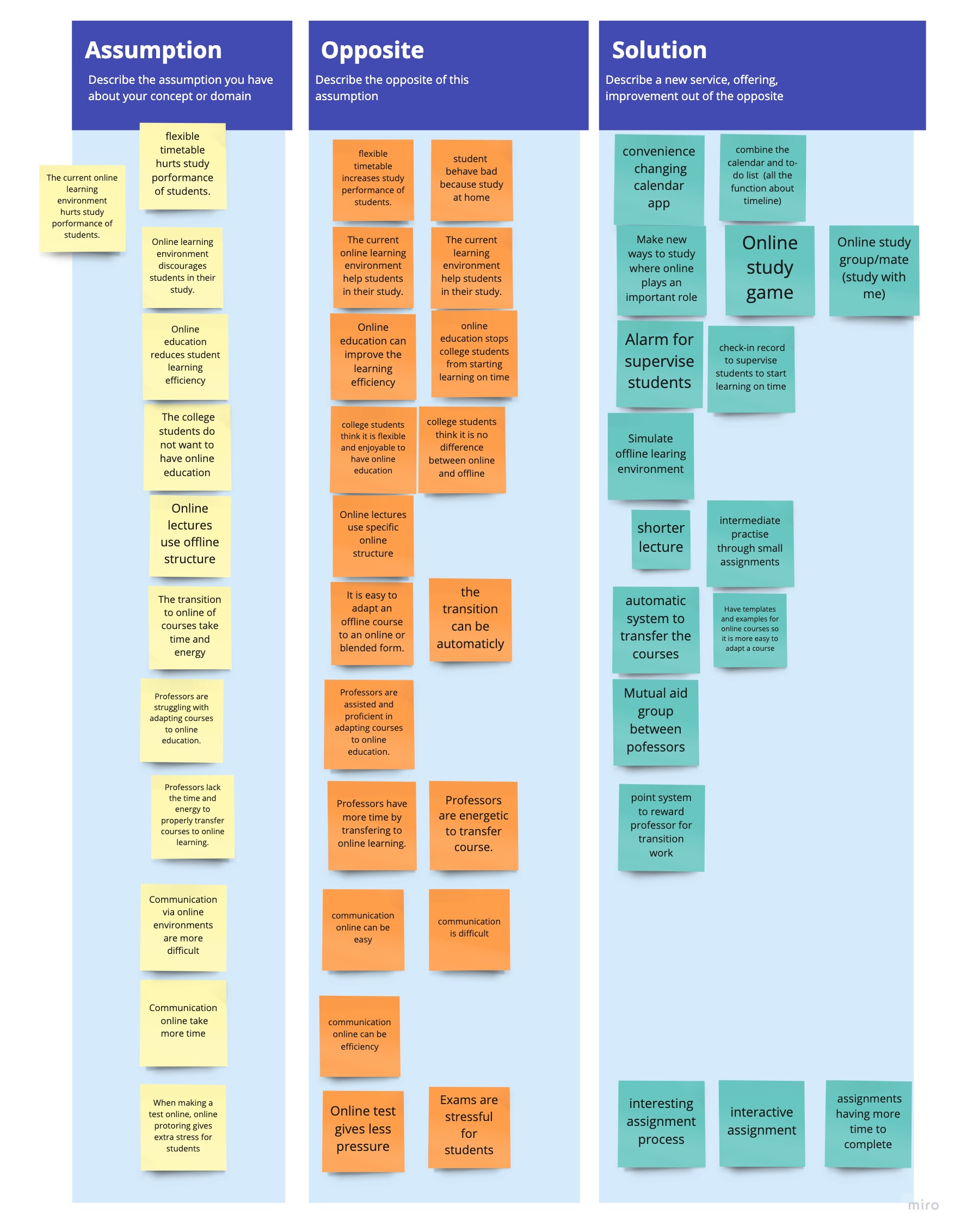 Accordingly, we used a opposite-thinking approach to brainstorming. Each team member wrote down several hypotheses about the issue at hand, trying to cover all aspects of the issue at hand, such as "students find it harder to concentrate in online classes than in live classes".