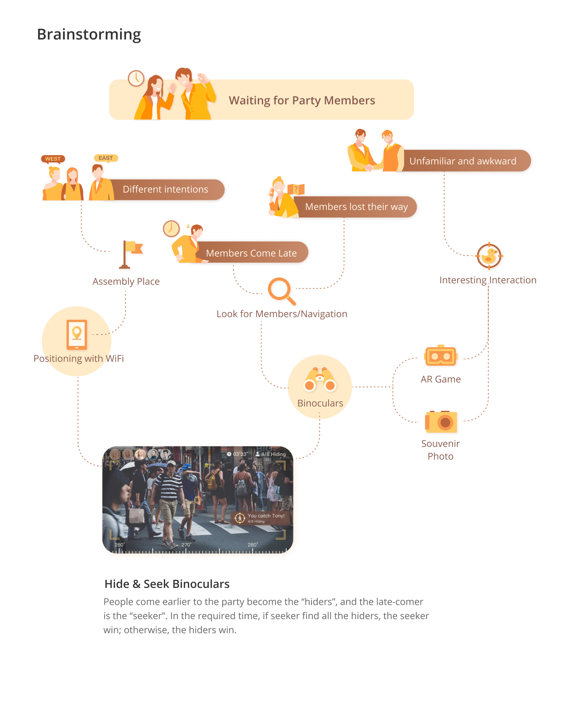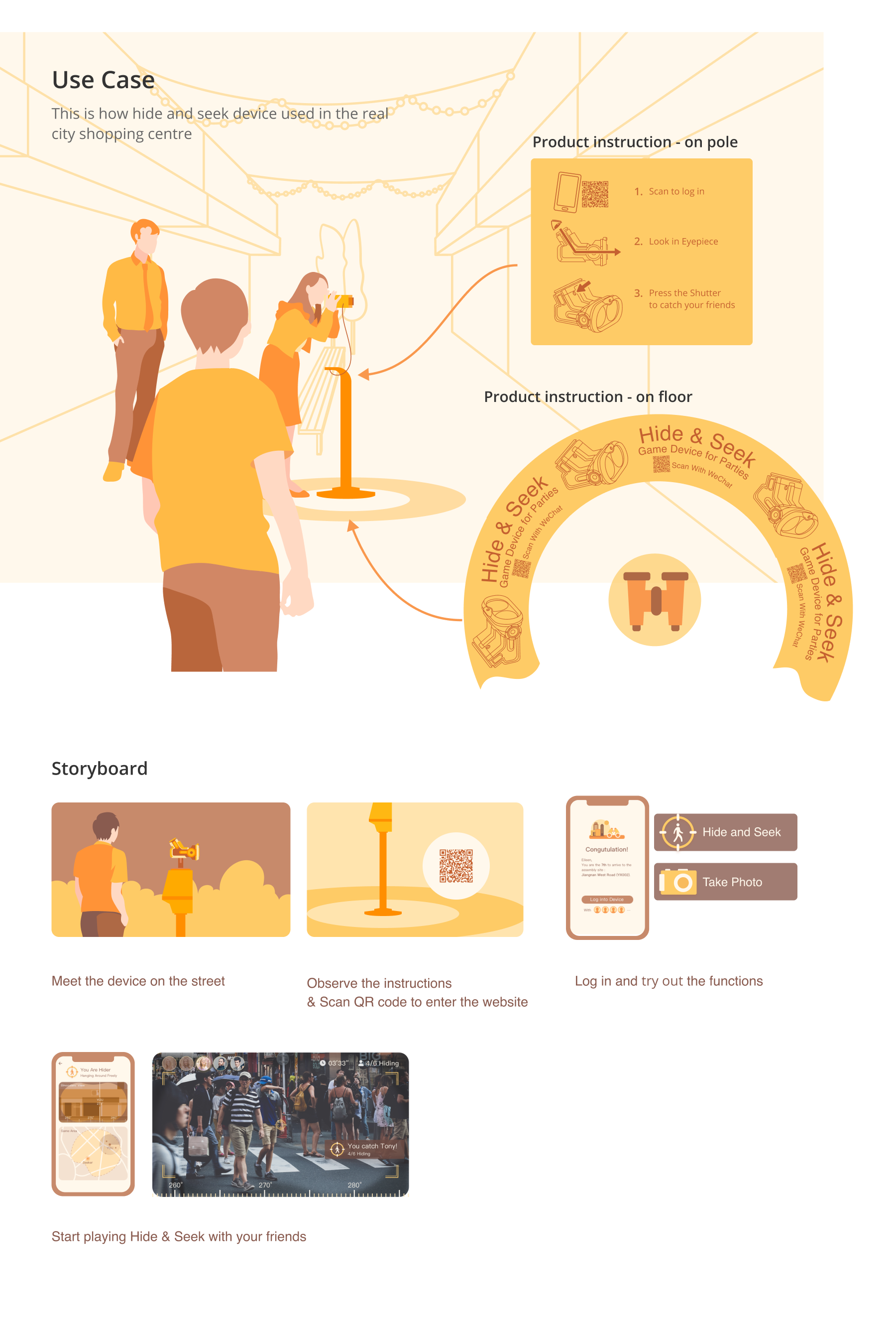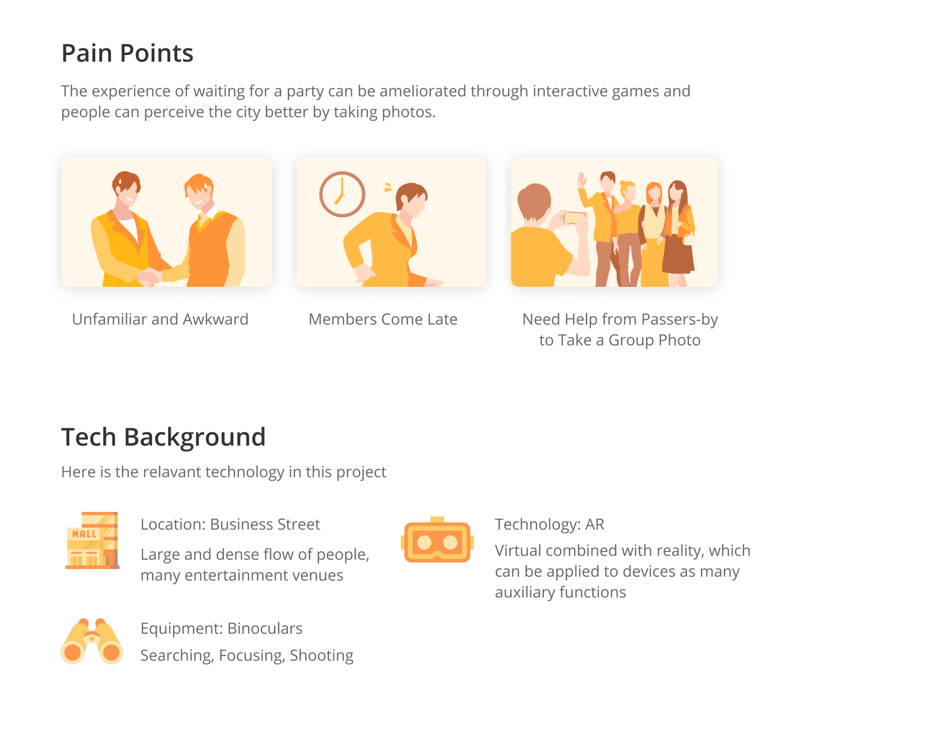 This AR functional device provides functions like Hide & Seek game for street tourists. The experience of waiting for a party can be ameliorated through interactive games and people can perceive the city better by taking photos.