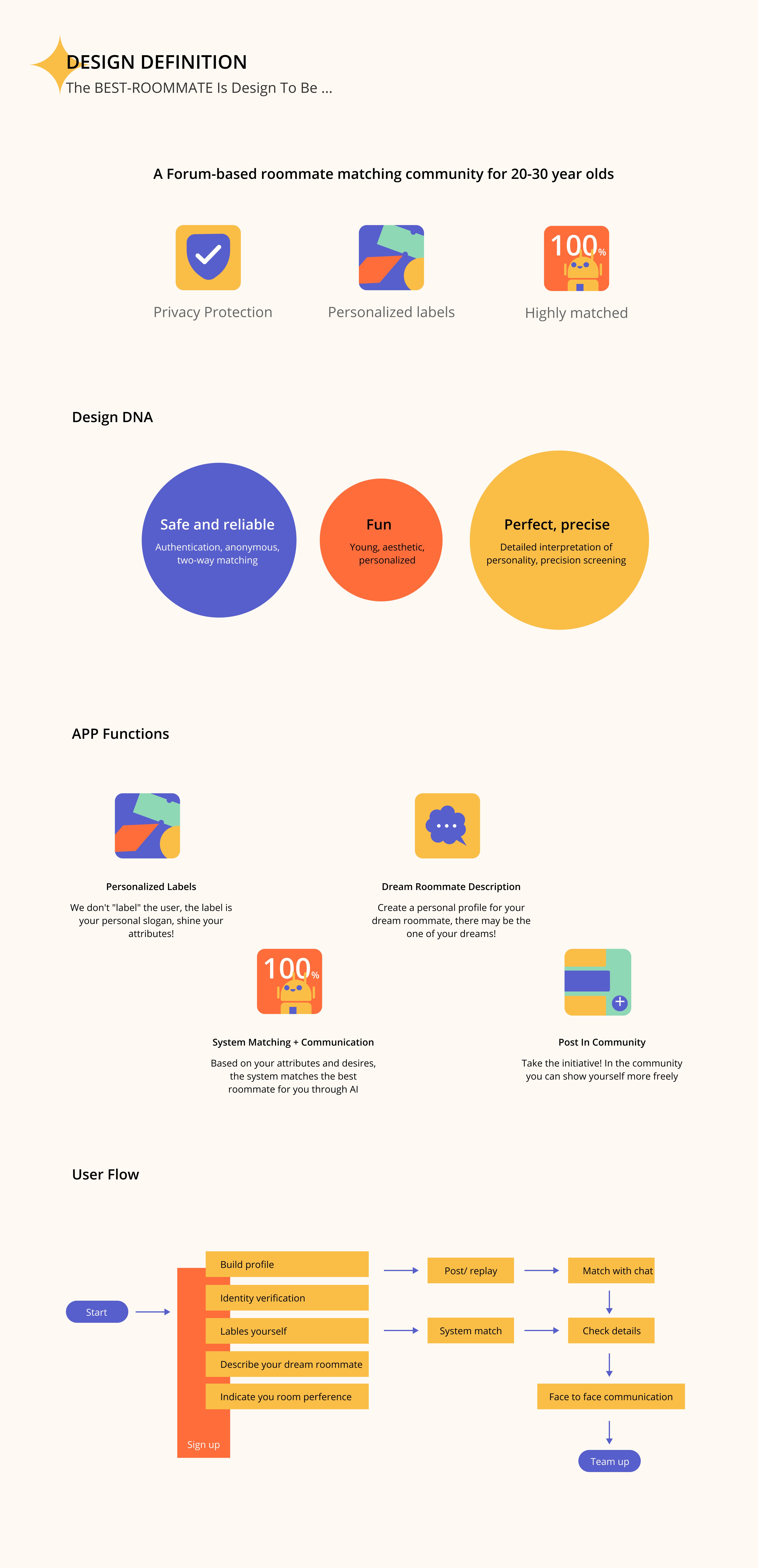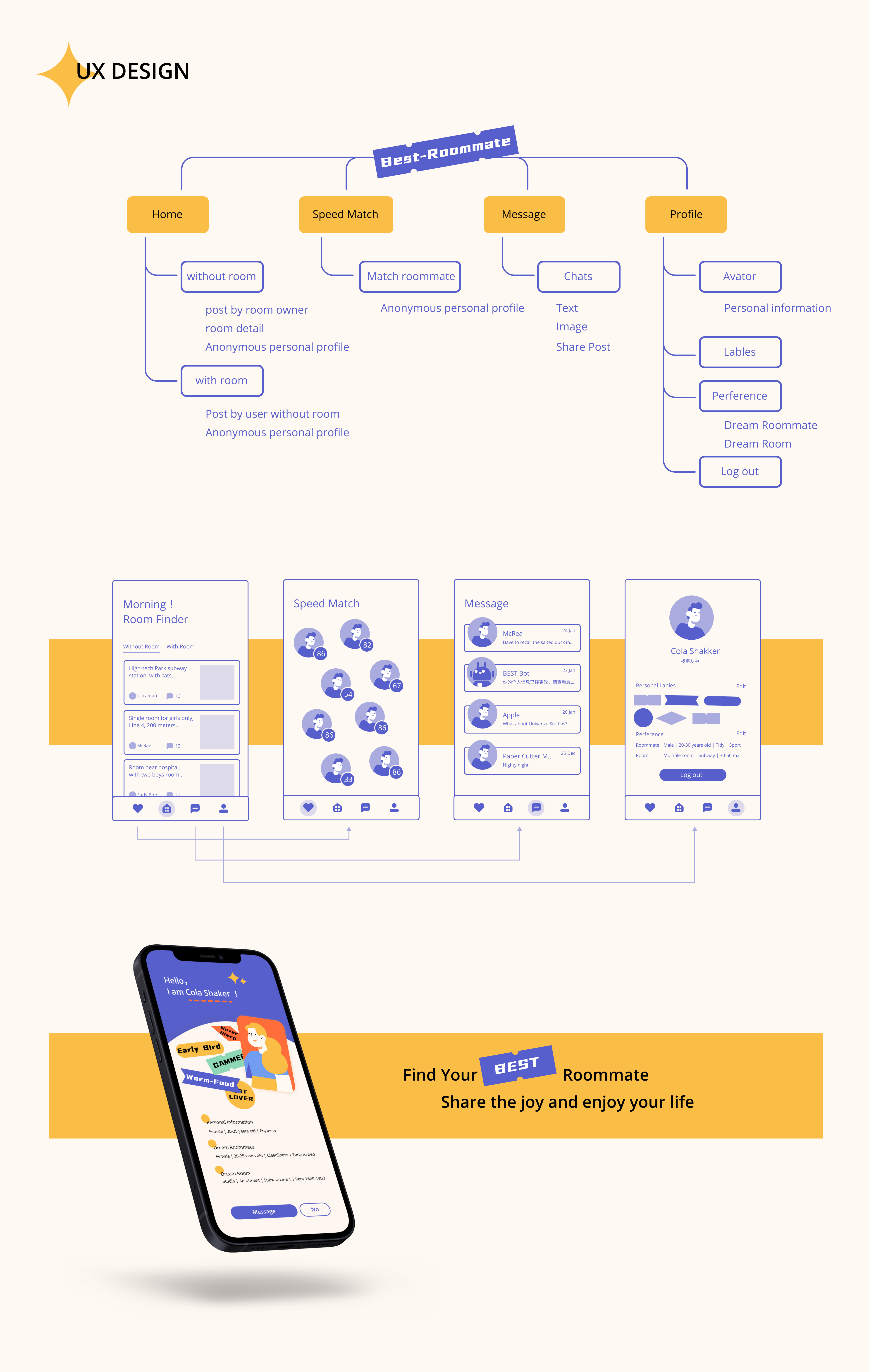 Best Roommate App is a startup that aims to provide a simple and secure platform for urban residents to find roommates in the same city. This design would help the brand to form a fun and personalized experience for young people, now the main force of rental housing。